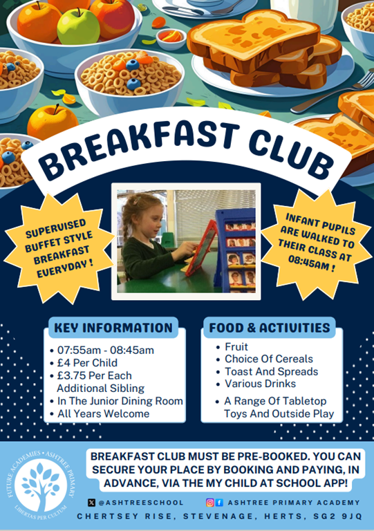 Breakfast club starts at 7:55am each day and is £4 per session. If you would like to join, please book a place on the My Child at School (MCAS) app at least 24 hours prior to breakfast club starting and 48 hours prior to after school club starting.